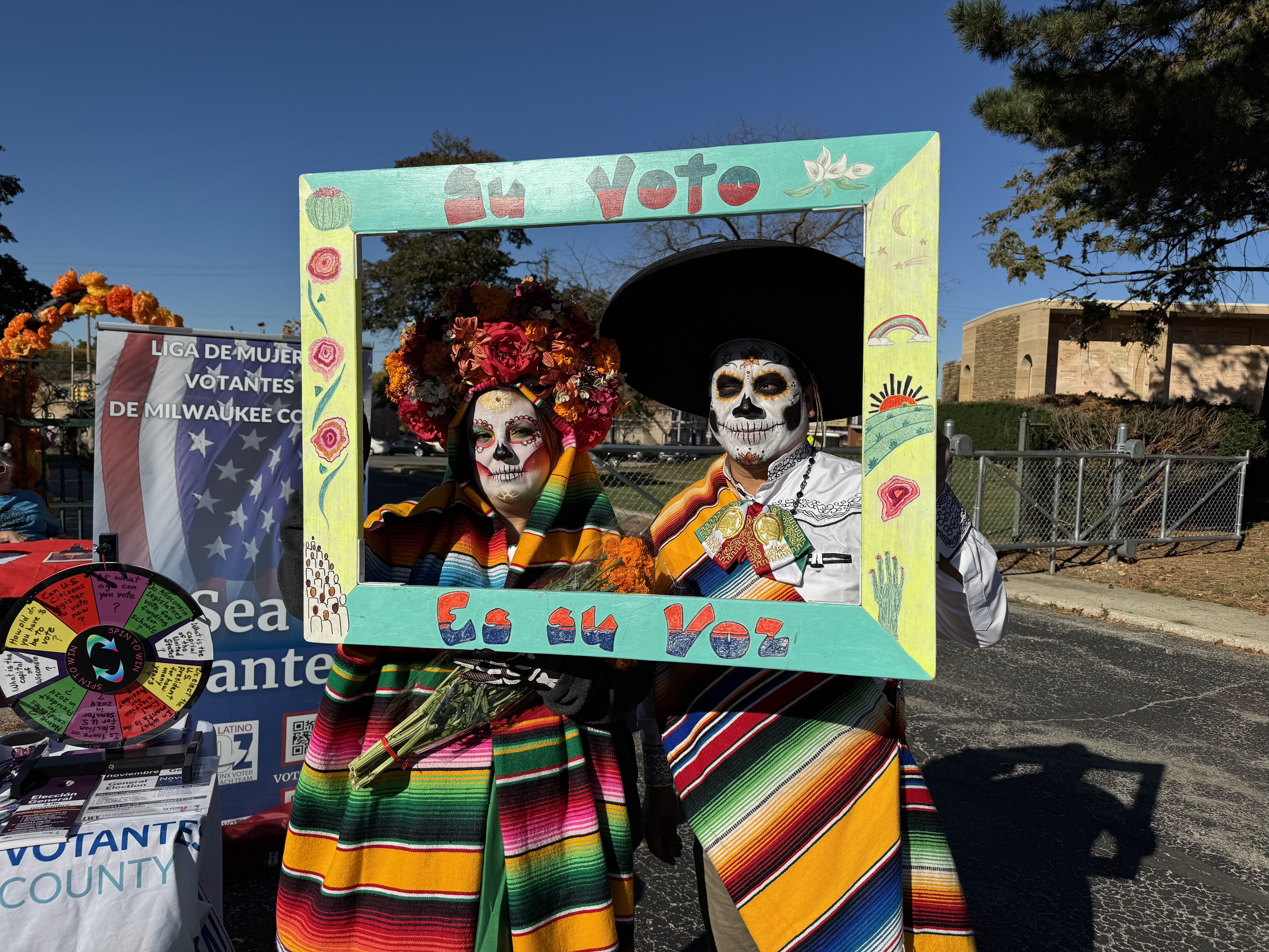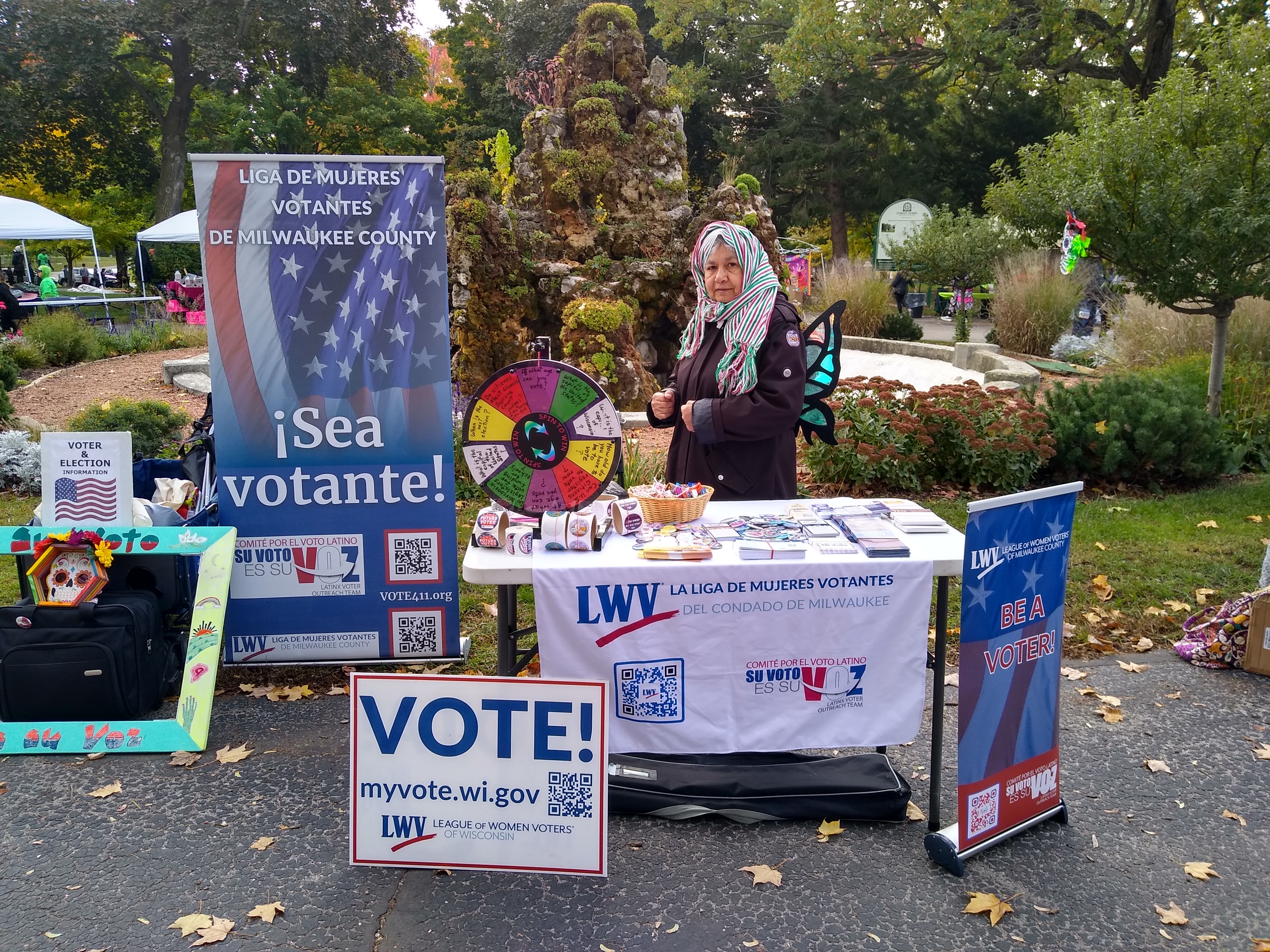 The Comite por el Vote Latino team joined the Day of the Dead celebration in Forest Home Cemetery Oct 25. A huge thank you to Esperanza Gutierrez, Barbara Medina, Carole Montgomery, Maria Avila and Diane Steigerwald (lead), who had an active and fun voter education table at this beautiful celebration and resource fair. League members interacted with about 300 attendees and other tablers / vendors. Families were attracted to the civics questions spin wheel and enjoyed the cool stickers and buttons, pens and candy. Taking photos with the picture frame of Su voto es su voz (Your vote is your voice) was popular. Instructions were given to about 20 people on how to check their voter registration, see their sample ballot before an election and use vote411. People who were already registered said they would go to the MyVote website. Many participants in the celebration expressed appreciation for the League’s advocacy and voter information. |  |  | |
